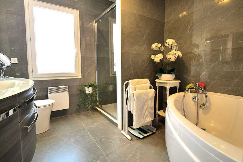 Une salle de bains avec baignoire, douche indépendante, et un WC,