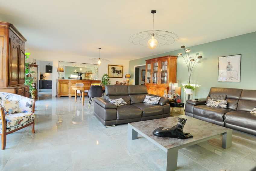 Vaste pièce à vivre de 56m² avec cheminée à insert, ouvrant sur sa terrasse et son jardin agrémenté d’un jacuzzi et d’une pergola bioclimatique.